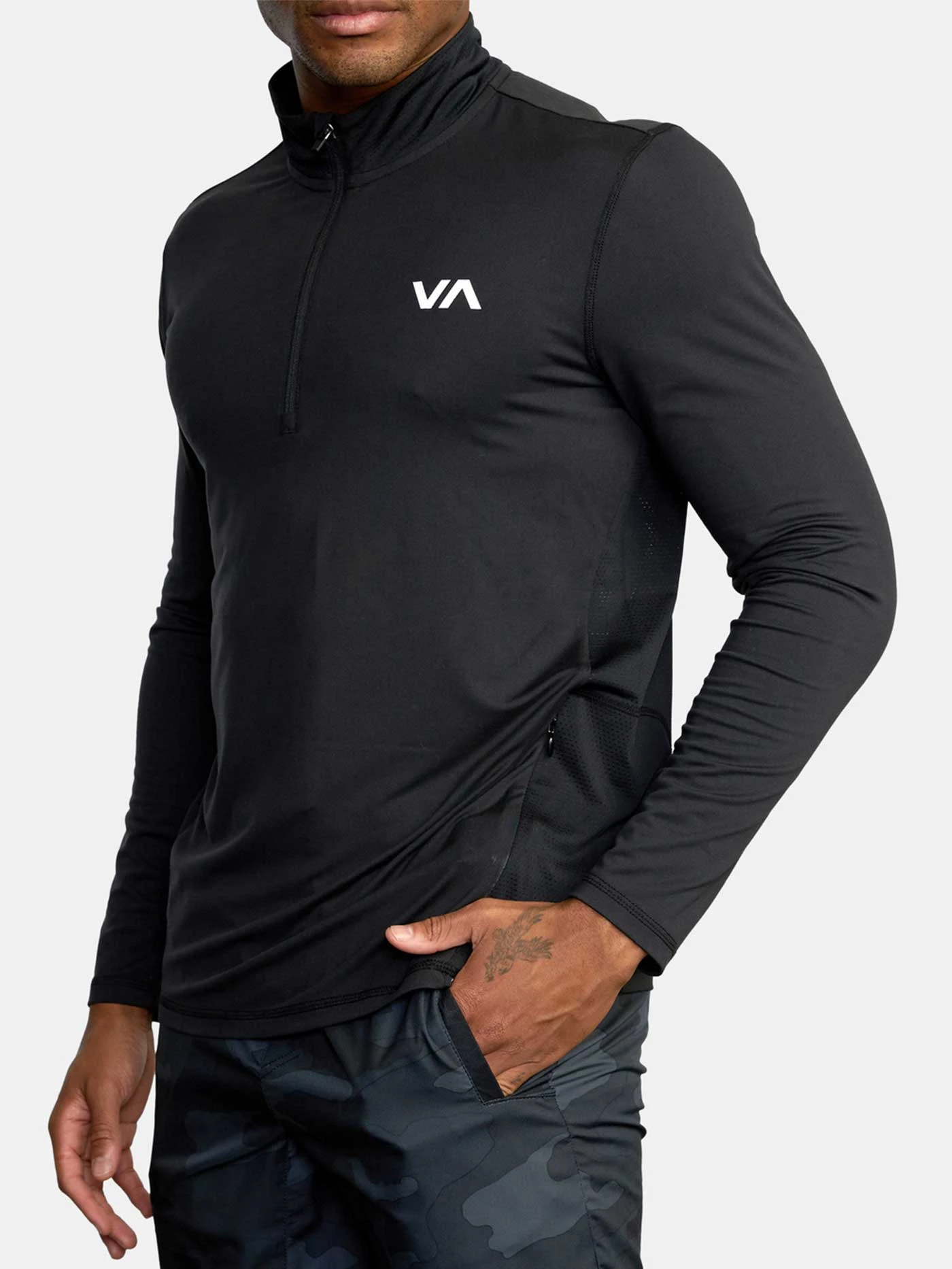 THE RVCA SPORT VENT HALF-ZIP PULLOVER OFFERS LIGHTWEIGHT COVERAGE, COMFORT AND STYLE IN ONE. MADE FROM RECYCLED POLY STRETCH, THIS HALF-ZIP LONG SLEEVE PULLOVER FEATURES A MOCK NECK, MESH GUSSETS AT THE SIDES AND BACK, HIDDEN POCKET WITH ZIPPER AND VA RVCA PRINTS THROUGHOUT.