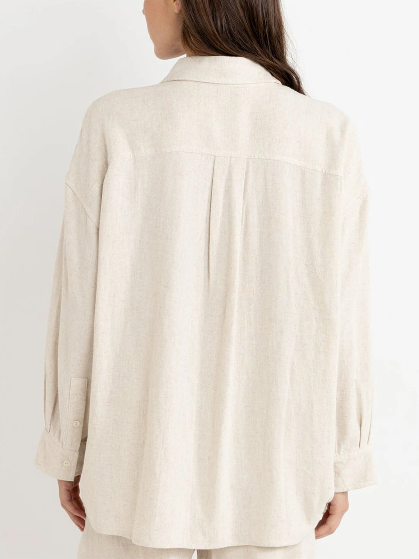 The Sunray Oversized Long Sleeve Shirt in Oat offers a relaxed, oversized fit with a pleat at the back. Its summary-front opening and cuff placket provide structure to this casual piece.
