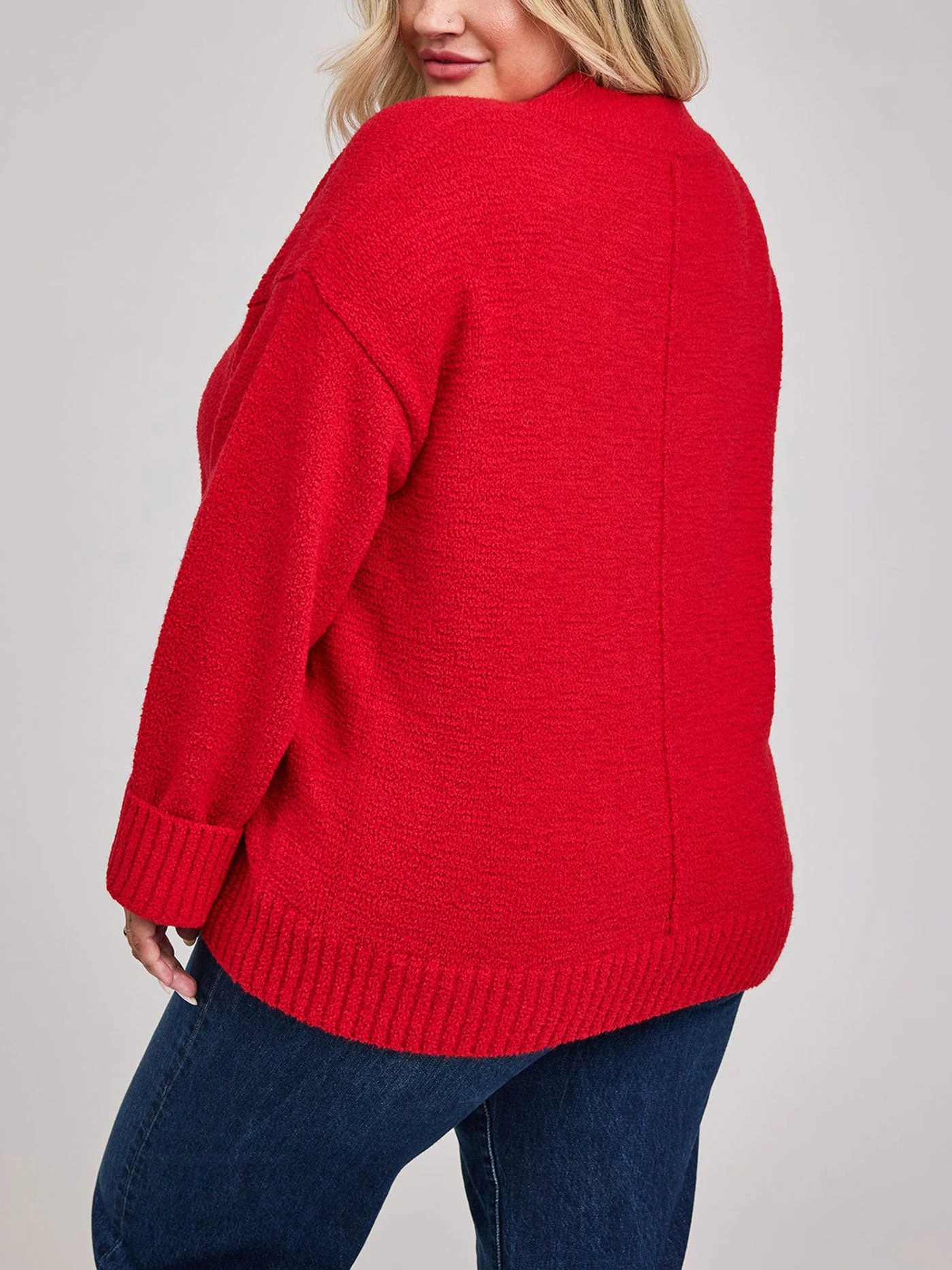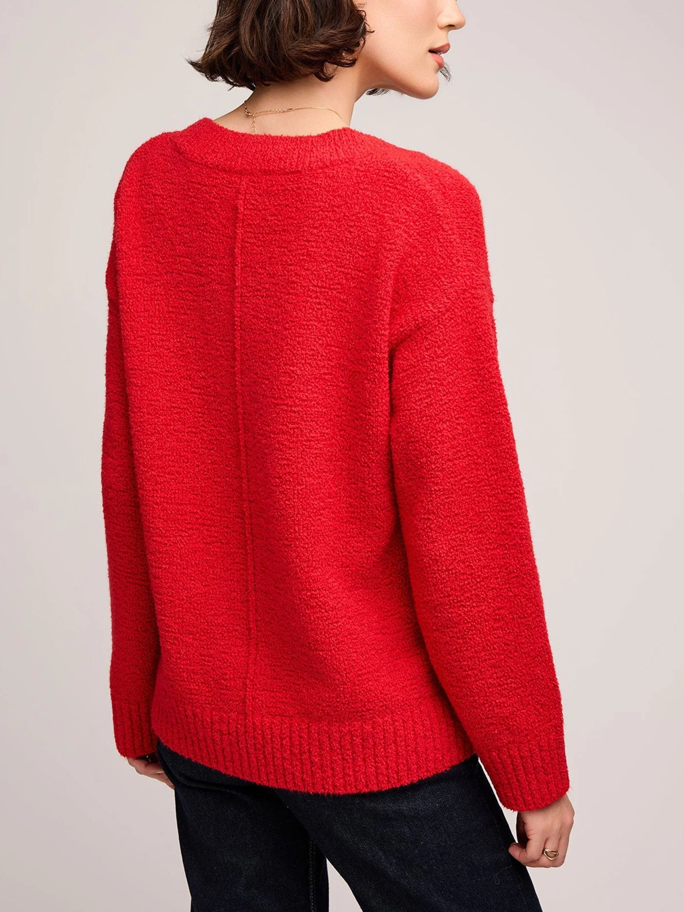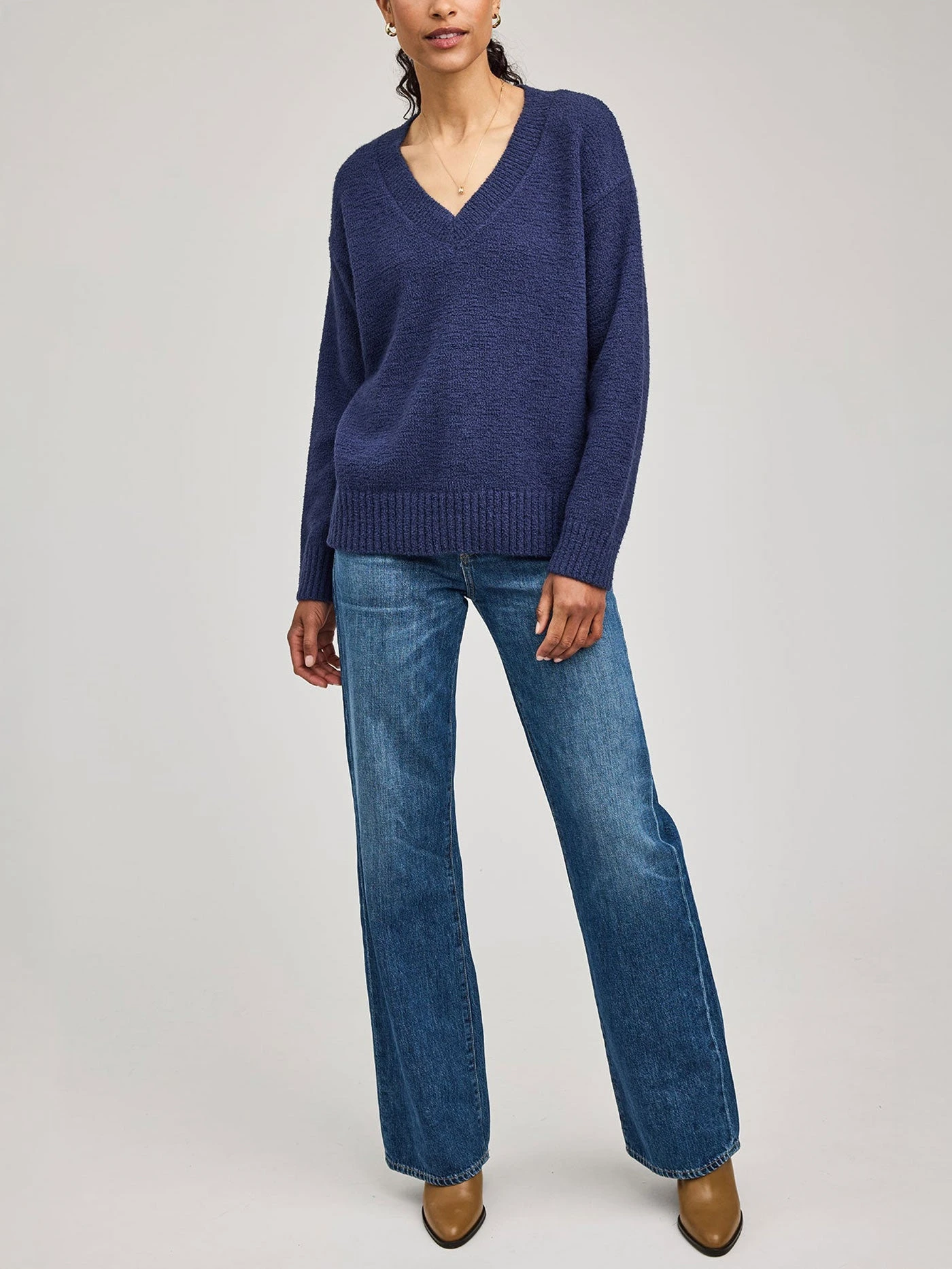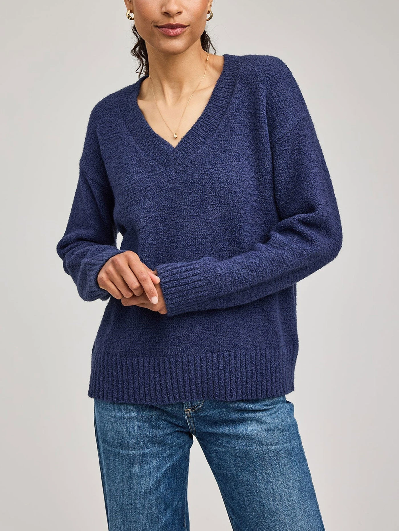 The Tilda sweater is made of a soft bouclé yarn in a jersey knit pattern. Features include a v-neckline and a ribbed cuff and hem for a casual feel.