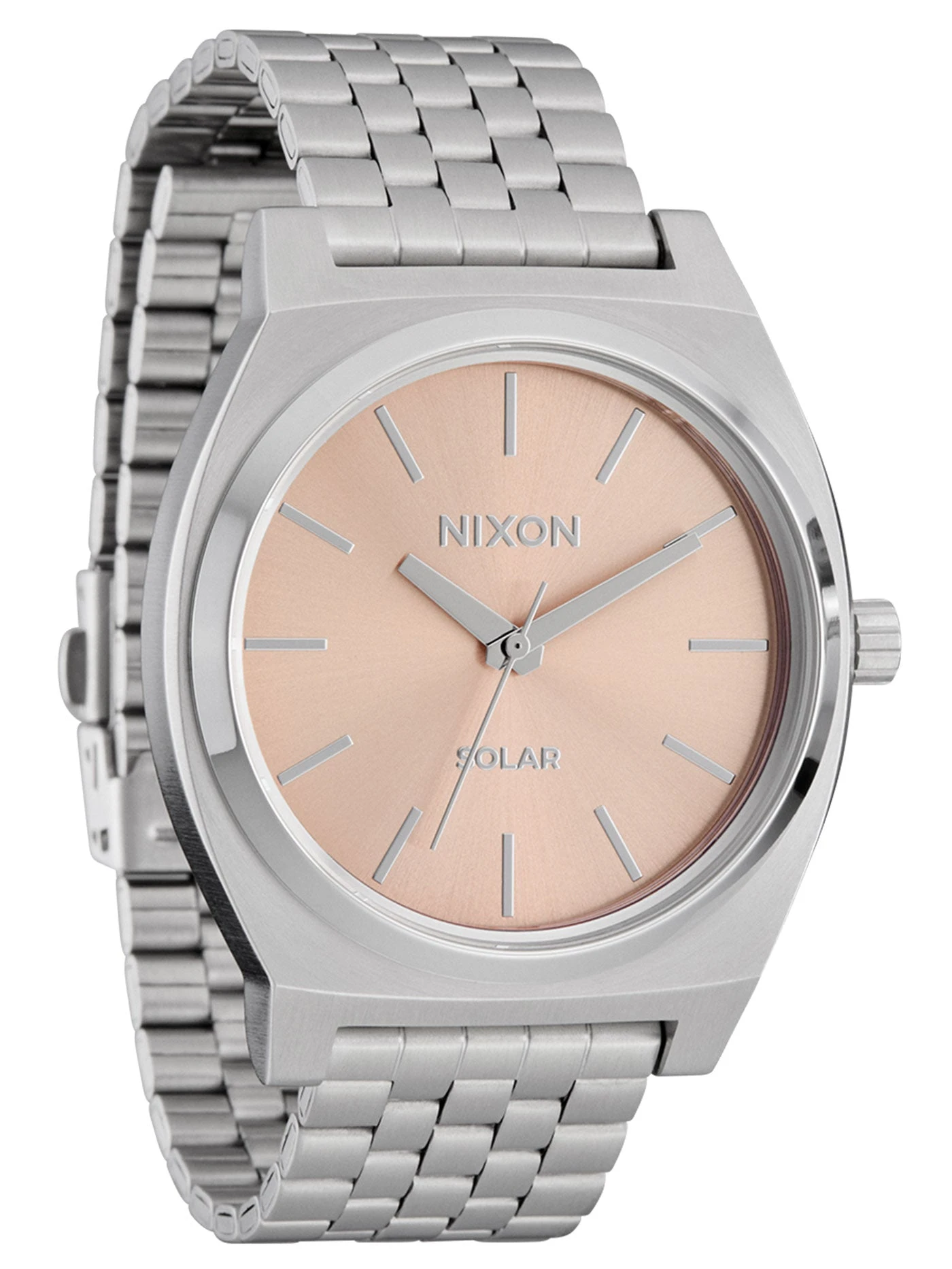 A true Nixon icon just got supercharged. Introducing the new Time Teller Solar. Built with the simple sophistication you know and love, the Time Teller Solar features a bigger case at 40mm, a new quick release 5-link bracelet with a deployment clasp that can be adjusted without a tool, and a 100m / 10 ATM waterproof rating. This watch is ready to make you look and feel good wherever you go.