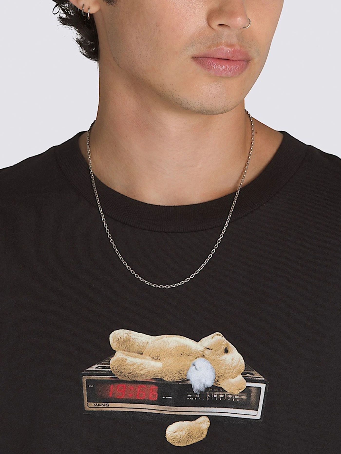The Time’s Up T-Shirt is a loose fit short sleeve crew neck T-shirt with a screenprinted graphic of a stuffed teddy taking a nap on an alarm clock bearing the Vans® origin date.