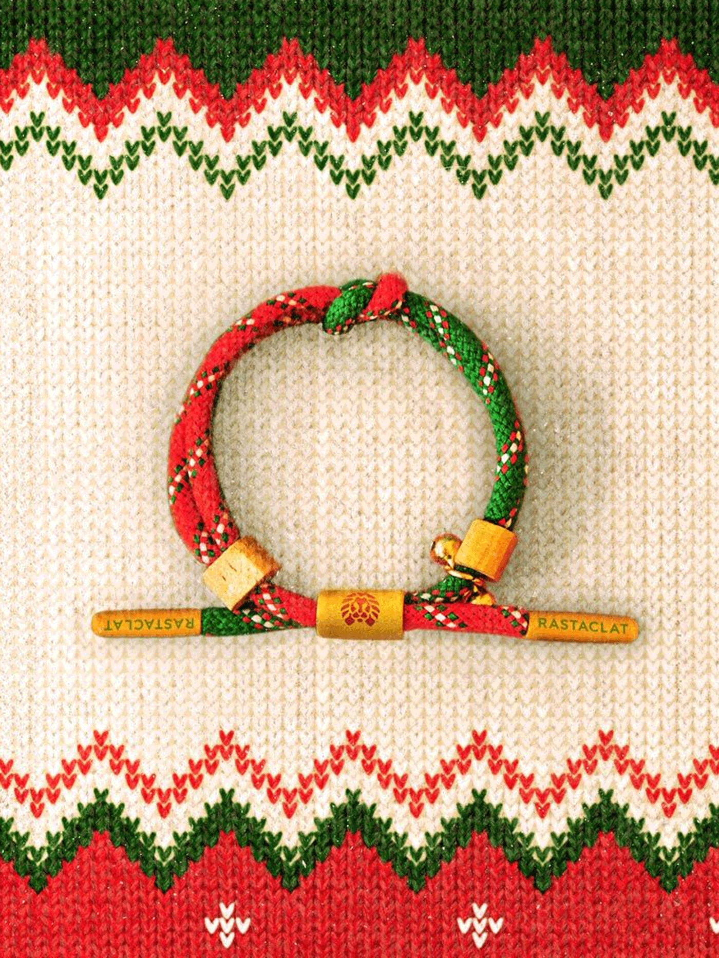 UGLY SWEATER PARTY: ON LOCK. INSPIRED BY THE TRADITIONAL UGLY SWEATER, WE’RE EXCITED TO INTRODUCE THIS LIMITED EDITION RED AND GREEN KNOTTED BRACELET. FEATURING WOOD HARDWARE, COMPLEMENTED WITH CONTRAST EMBLEMS AND A JINGLE BELL.