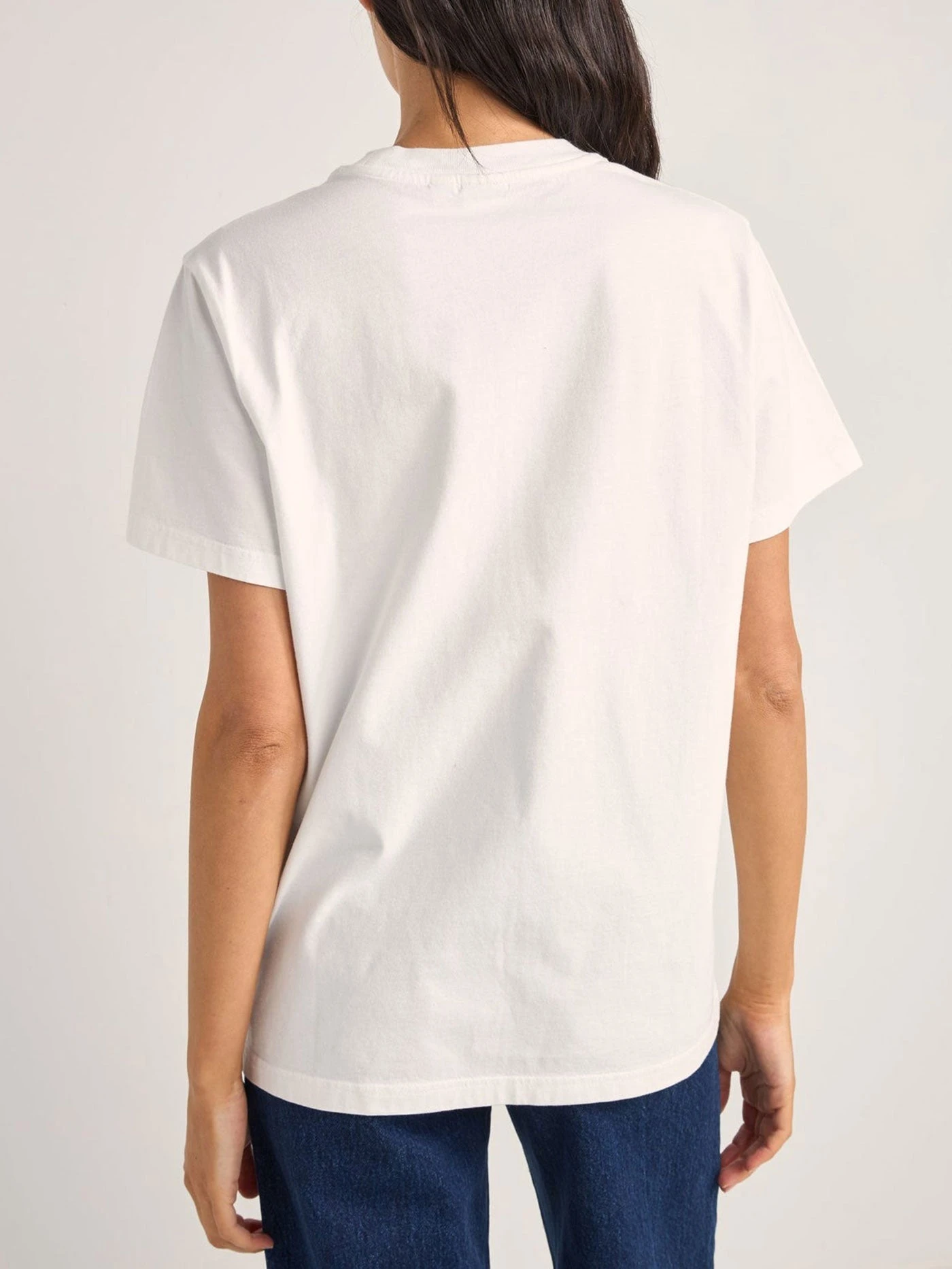 Discover our Vino Boyfriend Tee in WhiteÑa coastal essential for relaxed style. This oversized tee offers a soft hand feel for ultimate comfort and features a stylish screen print on the chest. Perfect for casual days by the sea.