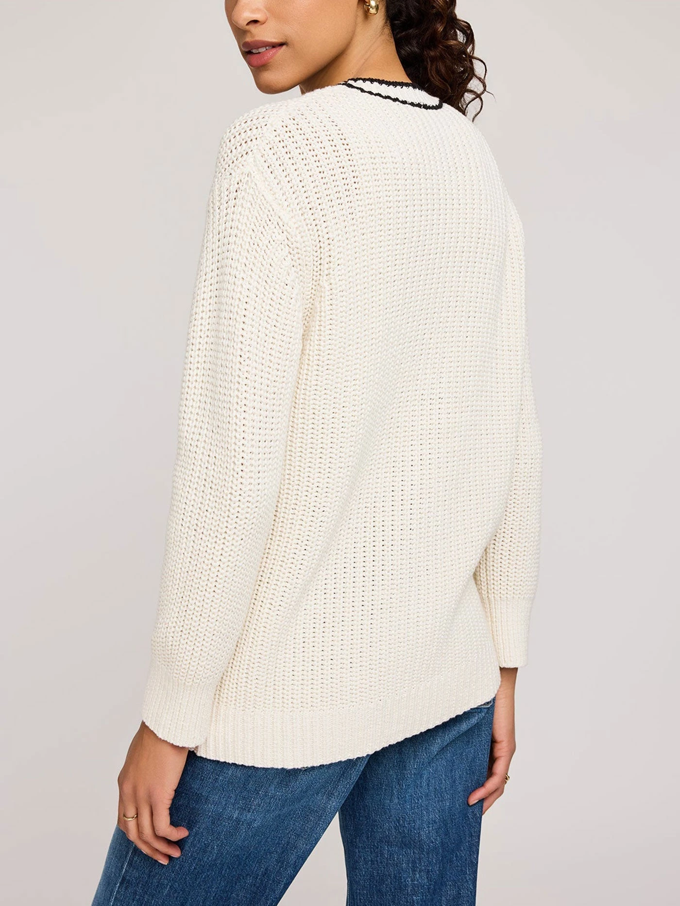 The Viola cardigan is made of a cotton blend yarn in a half cardigan stitch. Features include a front summary closure with a contrast stripe detail.