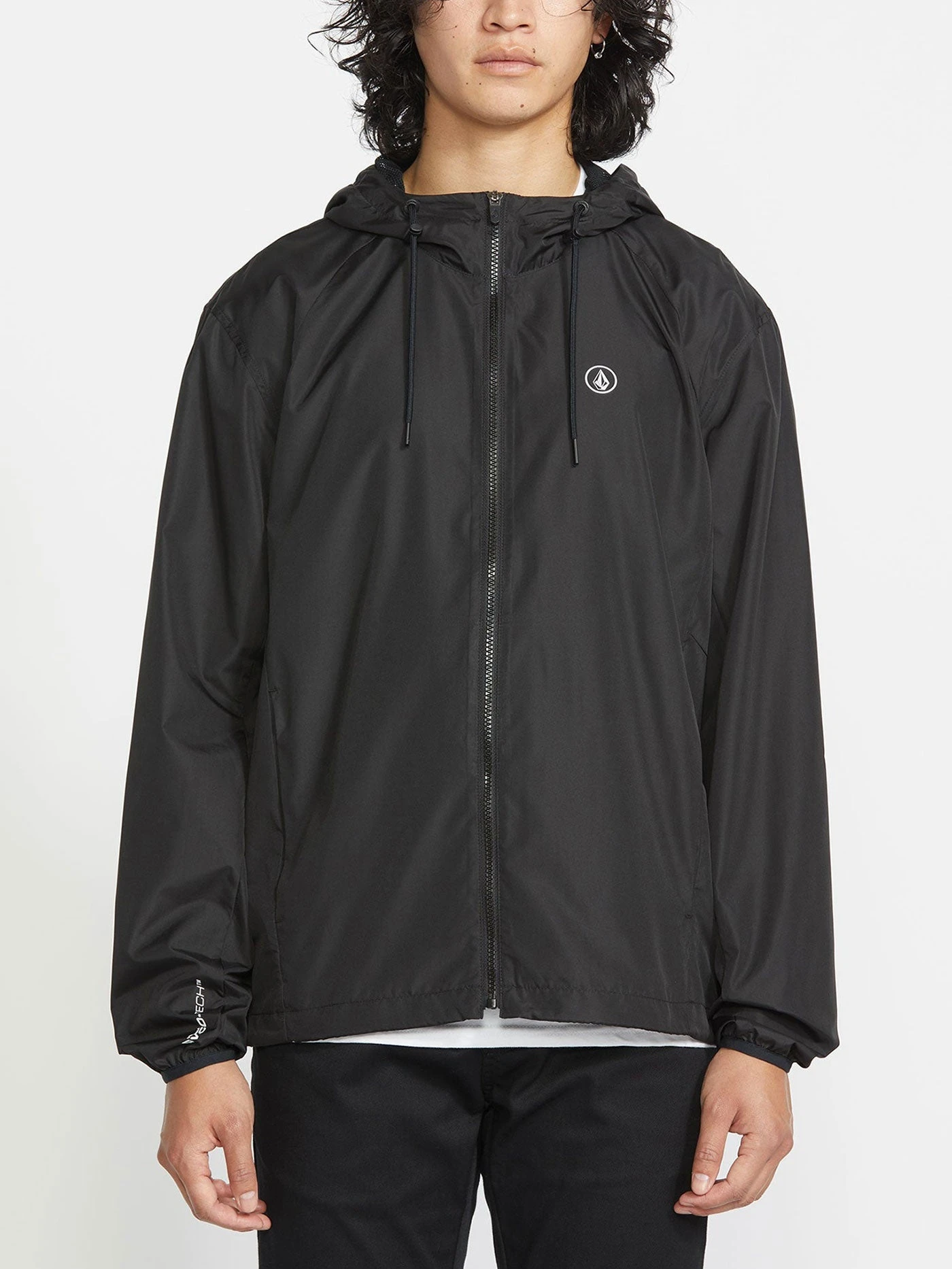 A sporty, water-resistant polyester blend jacket with a DWR finish, relaxed fit, and adjustable hood. Branded Volcom design with zip front, hand pockets, and elastic details.