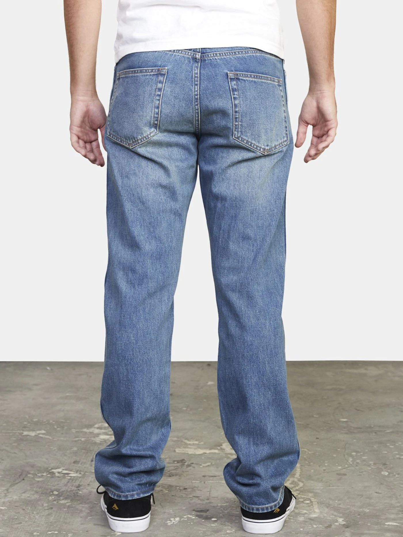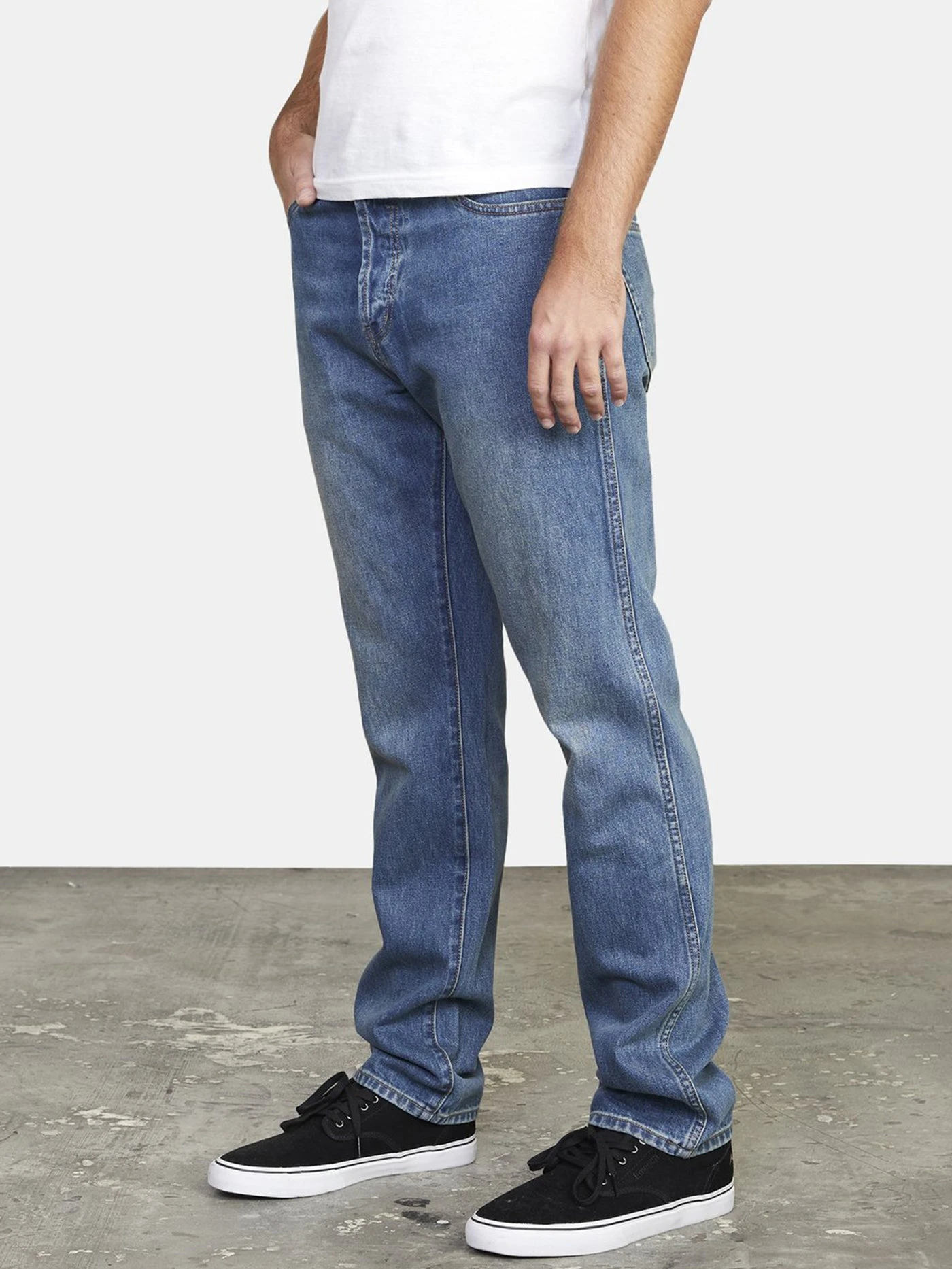 STRAIGHT FIT. MEDIUM RISE. TRUE STRAIGHT LEG. BUTTON FLY AND WAISTBAND WITH RVCA SHANK.
