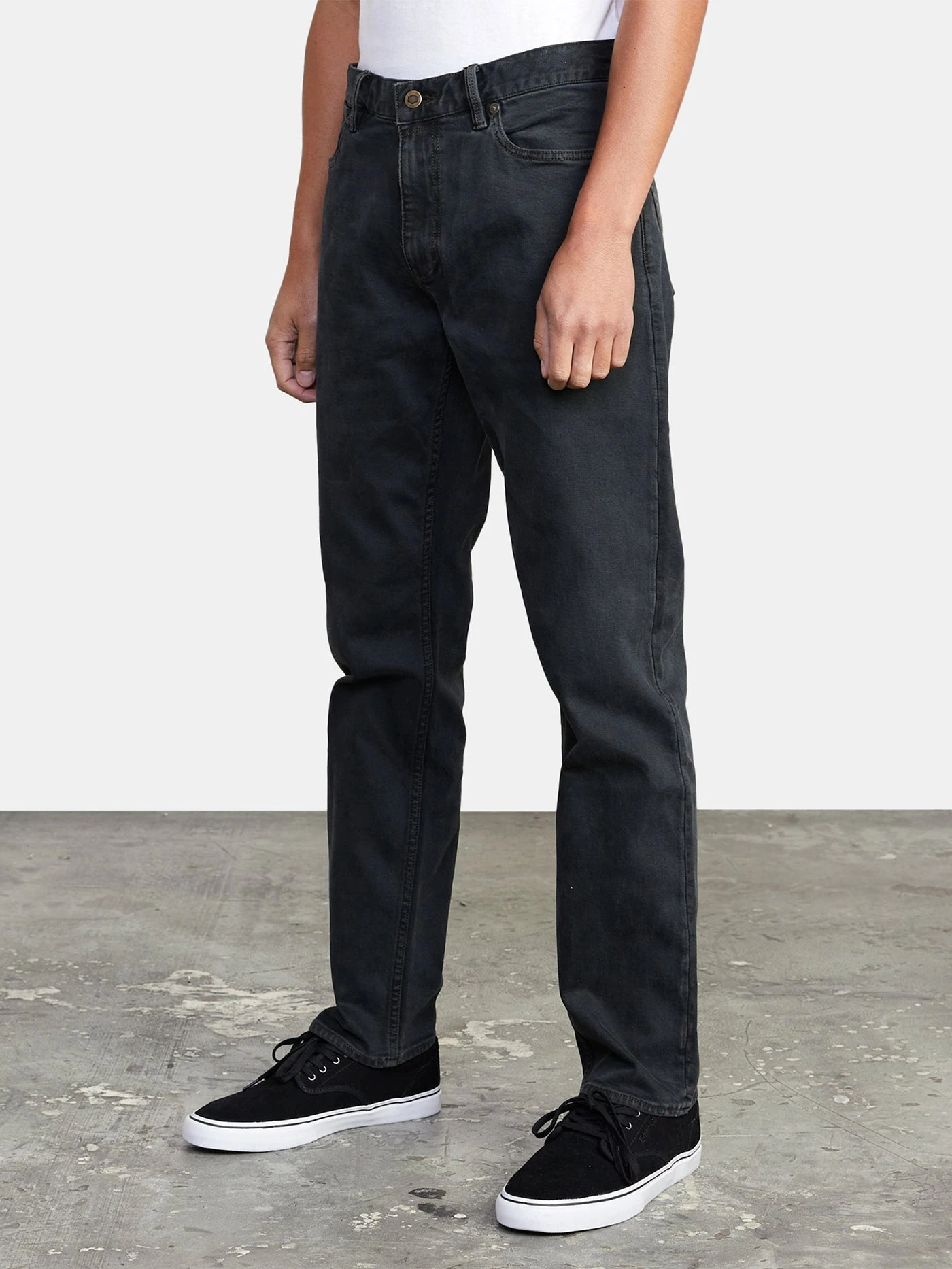 STRAIGHT FIT. MEDIUM RISE. TRUE STRAIGHT LEG. ZIPPER FLY WITH RVCA SHANK BUTTON CLOSURE AT WAISTBAND. 5 POCKET STYLING WITH RVCA FLAG LABEL AT FRONT COIN POCKET. VA EMBROIDERY AT WEARERS RIGHT OUTSEAM.