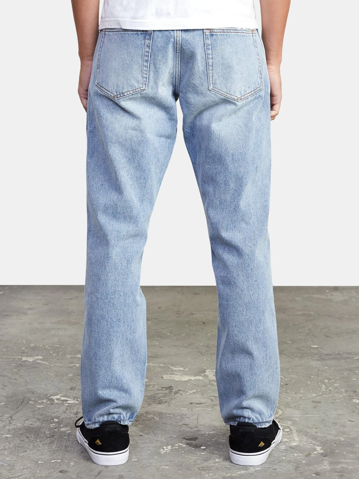 STRAIGHT FIT. MEDIUM RISE. TRUE STRAIGHT LEG. BUTTON FLY AND WAISTBAND WITH RVCA SHANK.