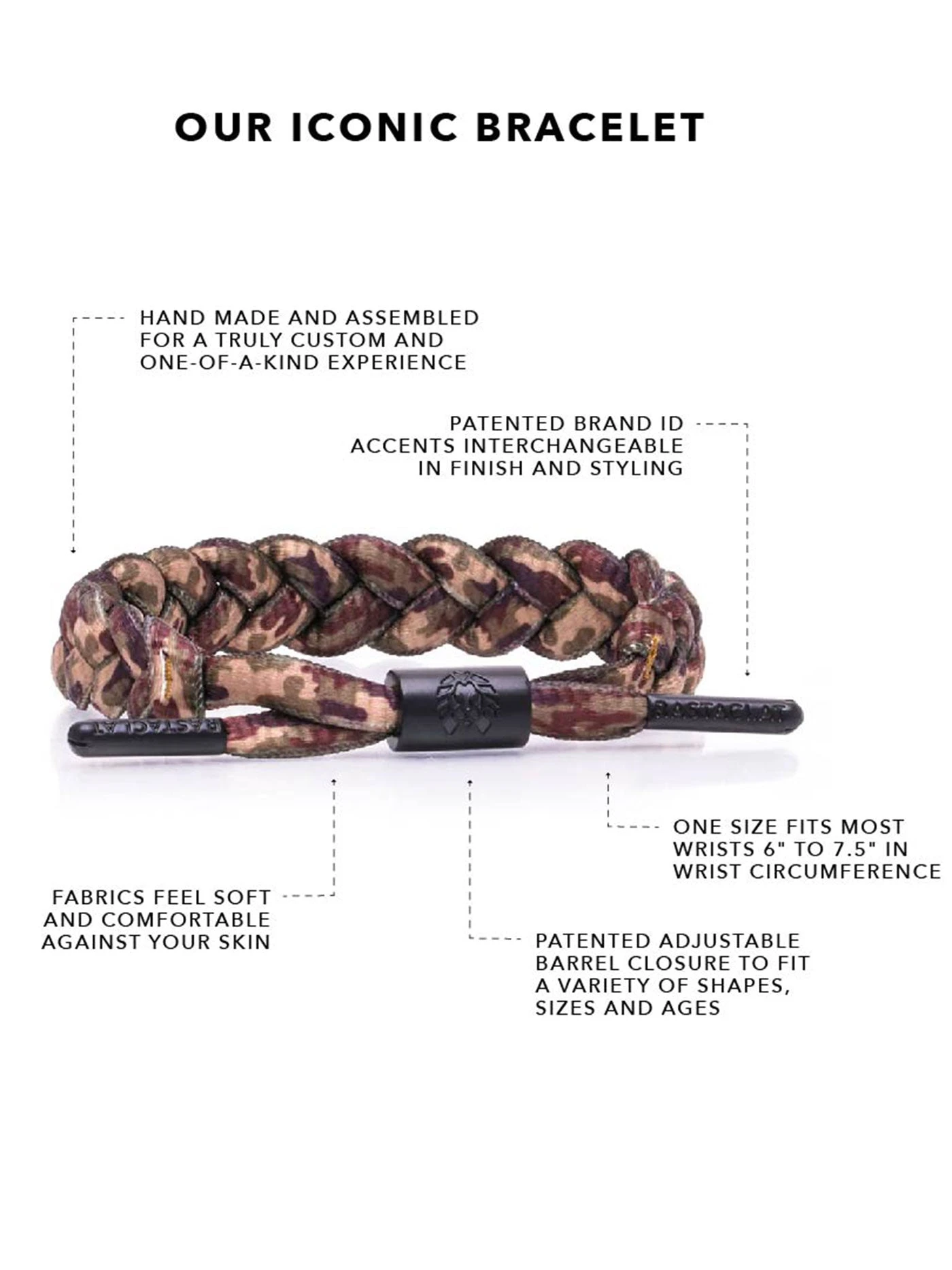 The latest in our camo print collection! This camo Rastaclat features a green camouflage print on a classic style braid with tonal matte hardware and emblems.