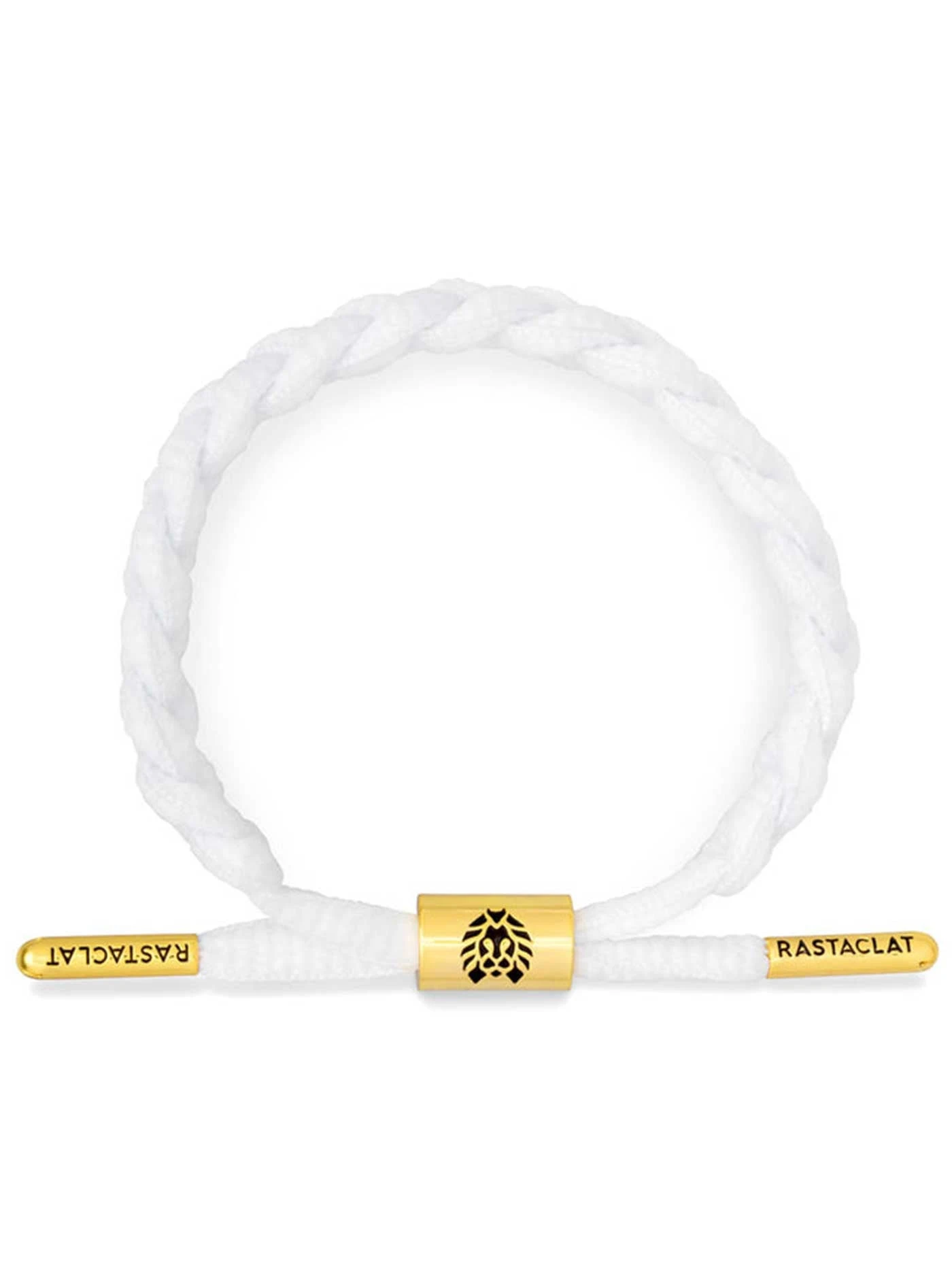 WHEN IN DOUBT, WEAR WHITE & GOLD OUT! THIS IS THE ORIGINAL WHITE SHOELACE BRACELET! THE ZION II – MEDIUM/LARGE FEATURES AN ALL WHITE CLASSIC STYLE BRAID WITH GOLD ELECTROPLATED HARDWARE.
